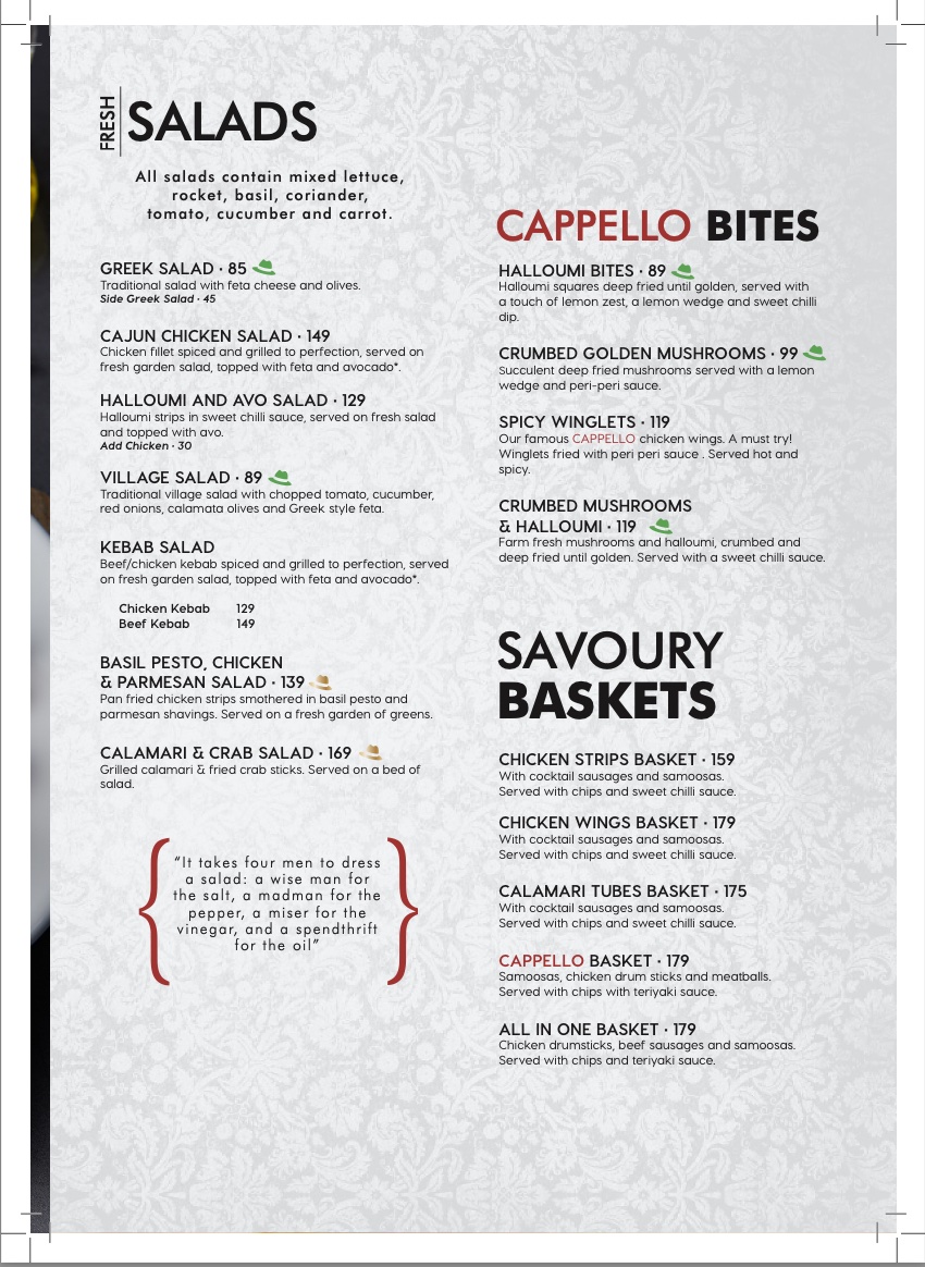 The menu at CAPPELLO NEWTOWN offers a relaxed selection of casual bites and comforting drinks, suited to a variety of moods and moments. Whether you're settling in for a laid-back lunch, sharing small plates with friends over cocktails, or enjoying late-night dining after dancing, the food and drink choices complement the vibrant atmosphere.